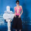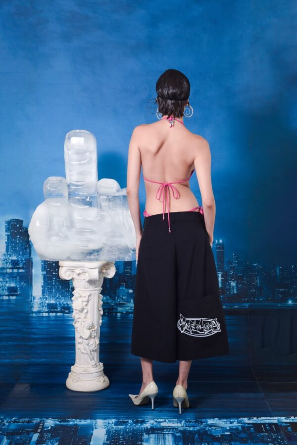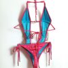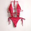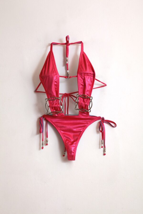 Body bikini en tela brillante fucsia forrado con lycra azul y área de zona intima en 100% algodón (mariposa).Acompañado de herrajes chunky plata delanteros y con terminaciones de herrajes plata en los cordones,detalle de joyeria “SC♡” en plata.
