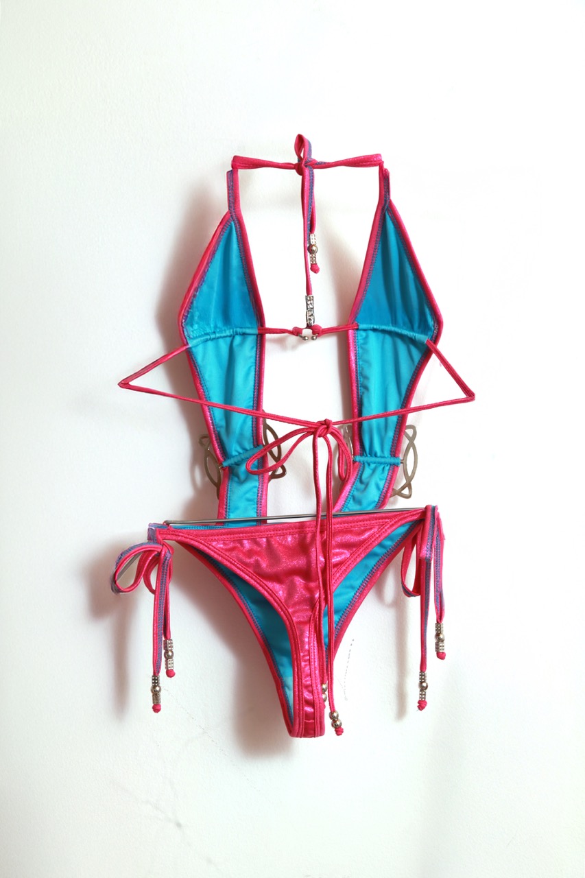 Body bikini en tela brillante fucsia forrado con lycra azul y área de zona intima en 100% algodón (mariposa).Acompañado de herrajes chunky plata delanteros y con terminaciones de herrajes plata en los cordones,detalle de joyeria “SC♡” en plata.