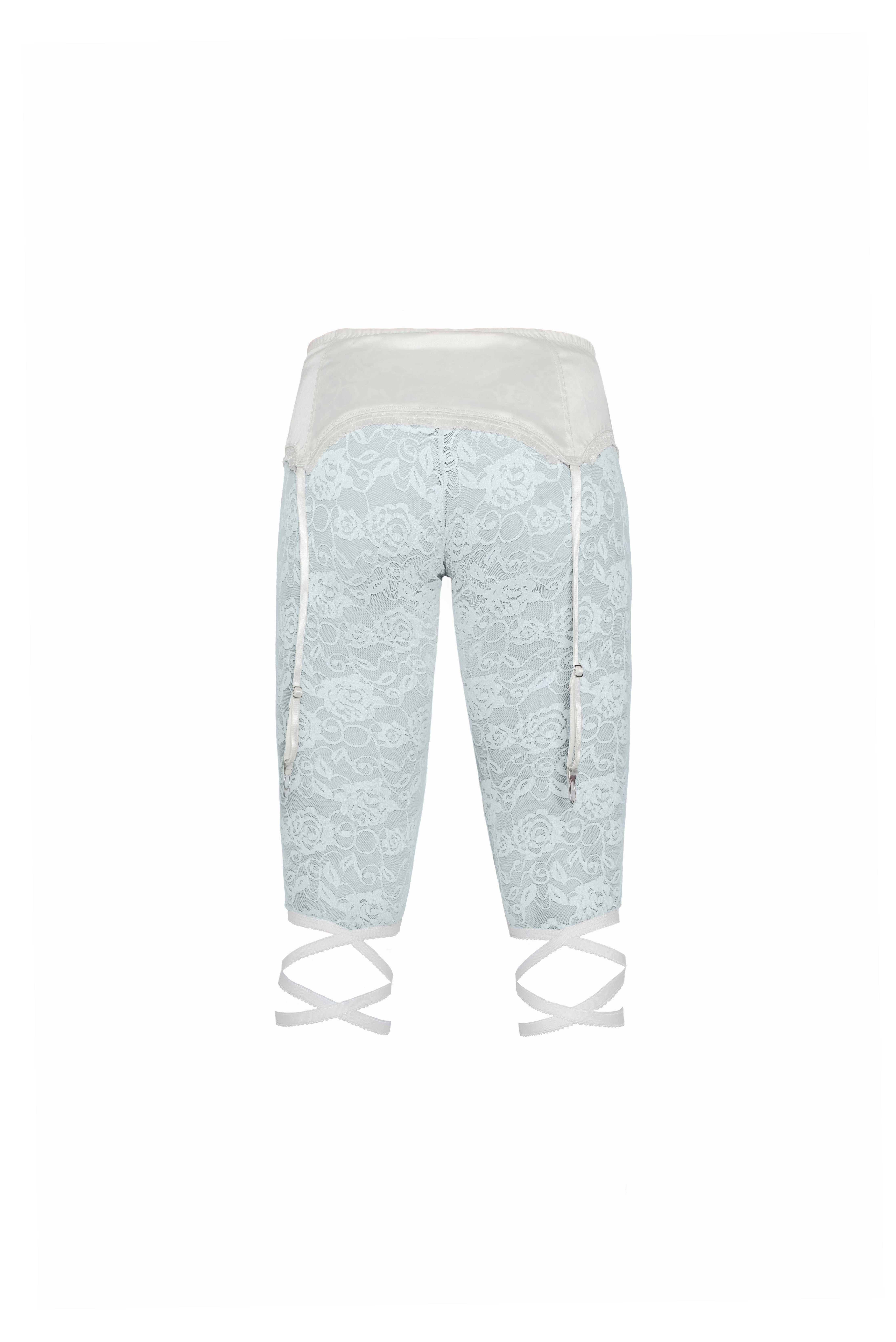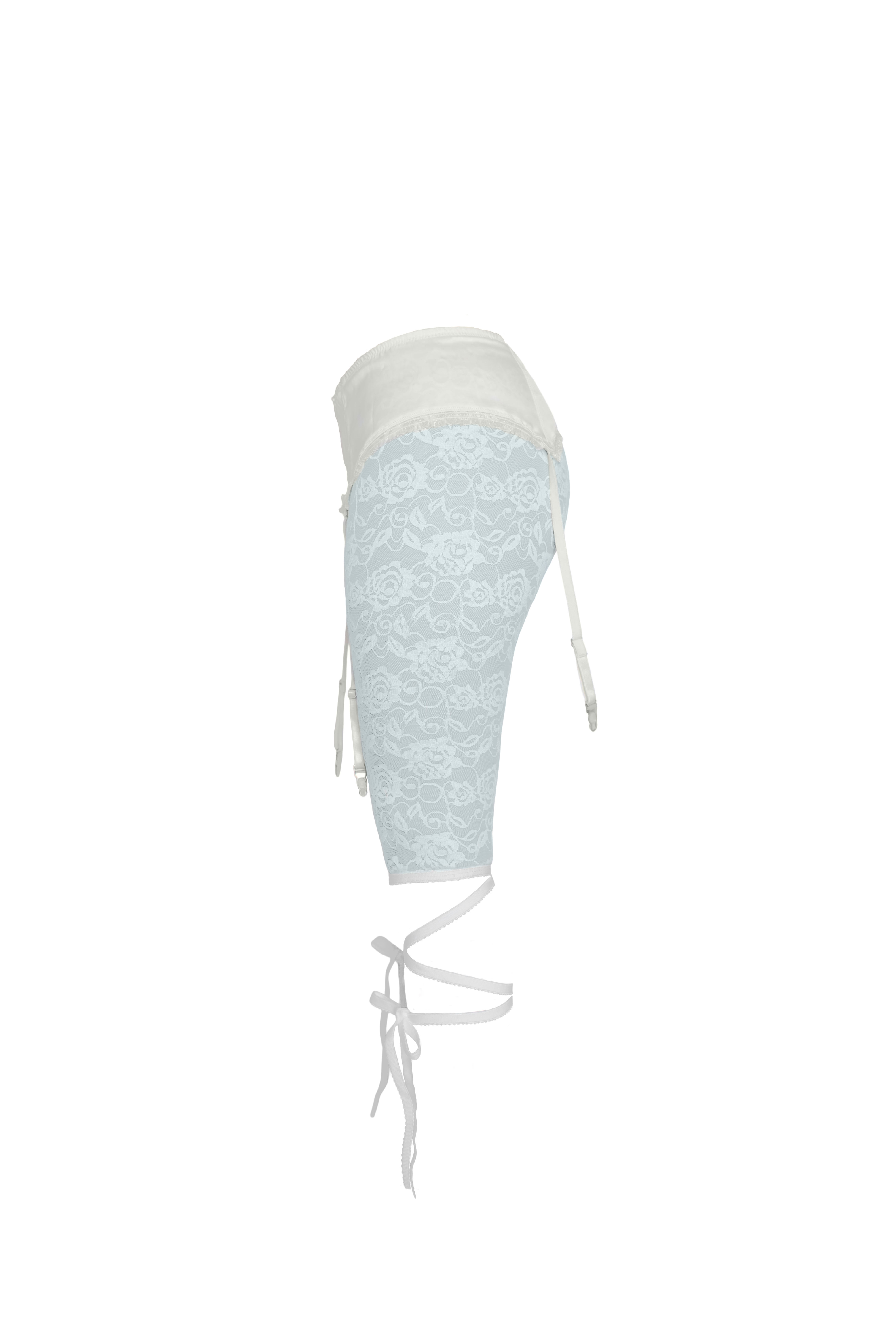 Capri de encaje menta crema con liguero en silk satin licrado champaña, acompañado de broches en metal