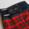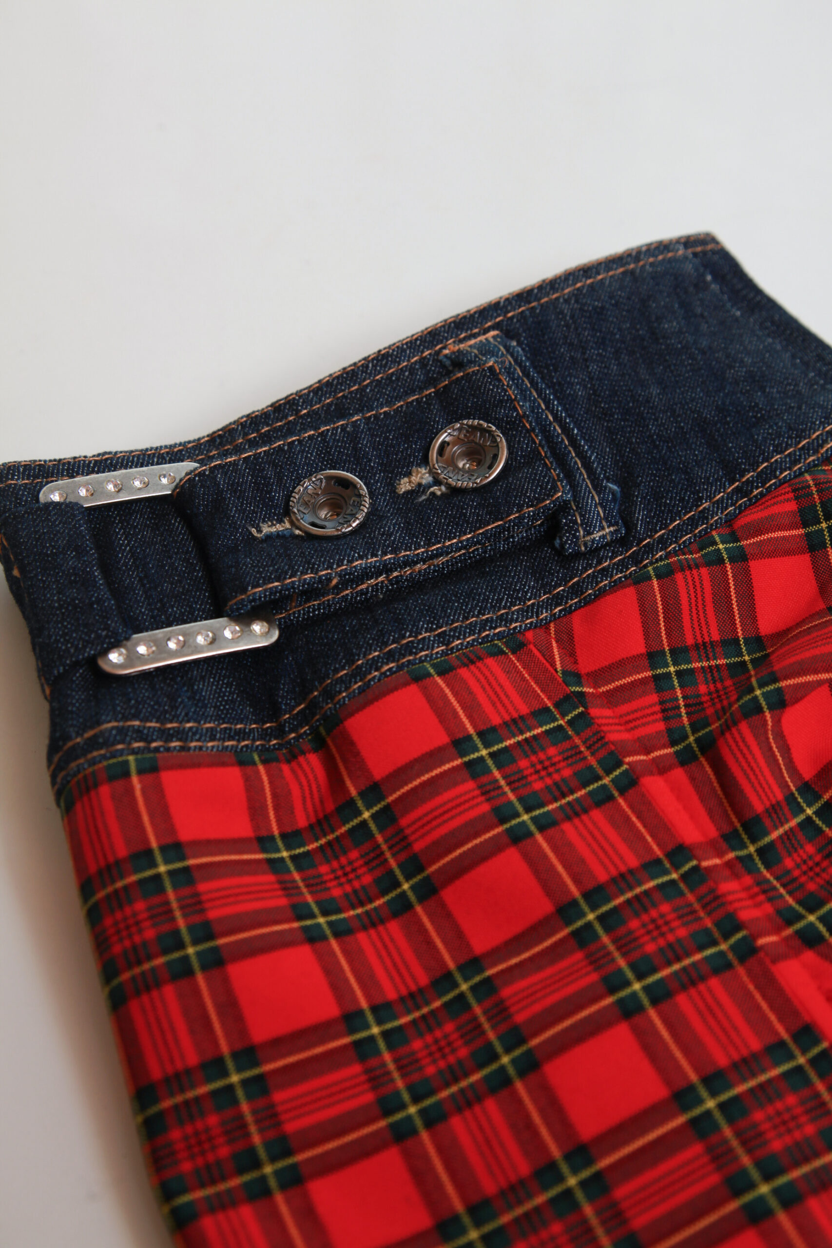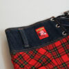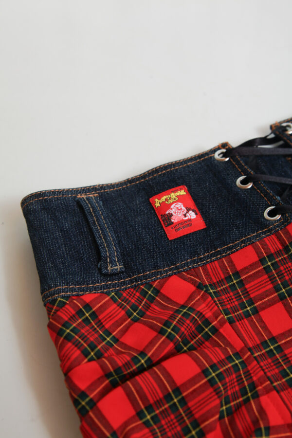 Ultra mini falda/corset upcycling fruncida en textil vintage de tartan y denim con ojales en plata, acompañado de cintasatinada negra.One of a kind, no replicas no repeats