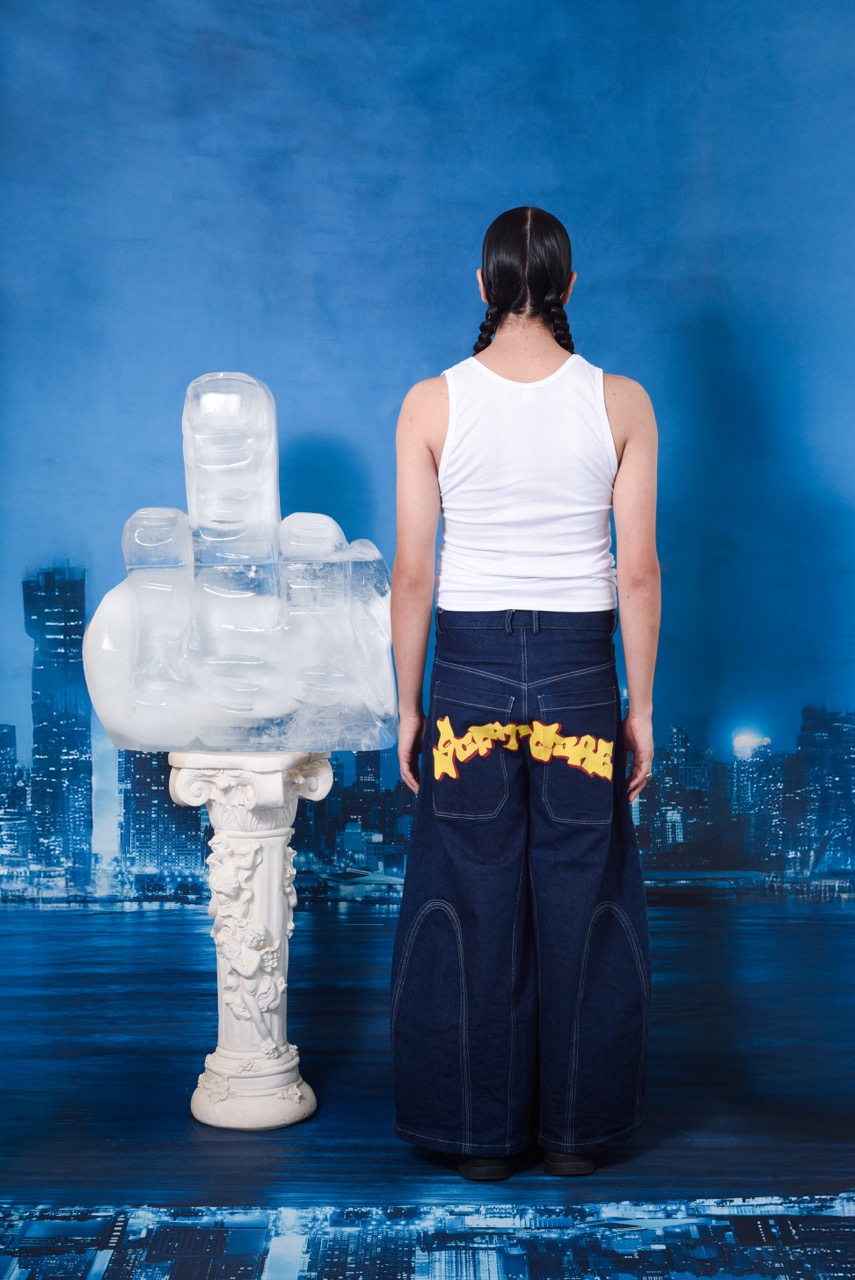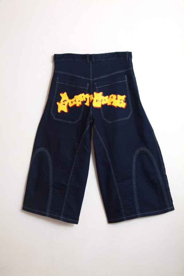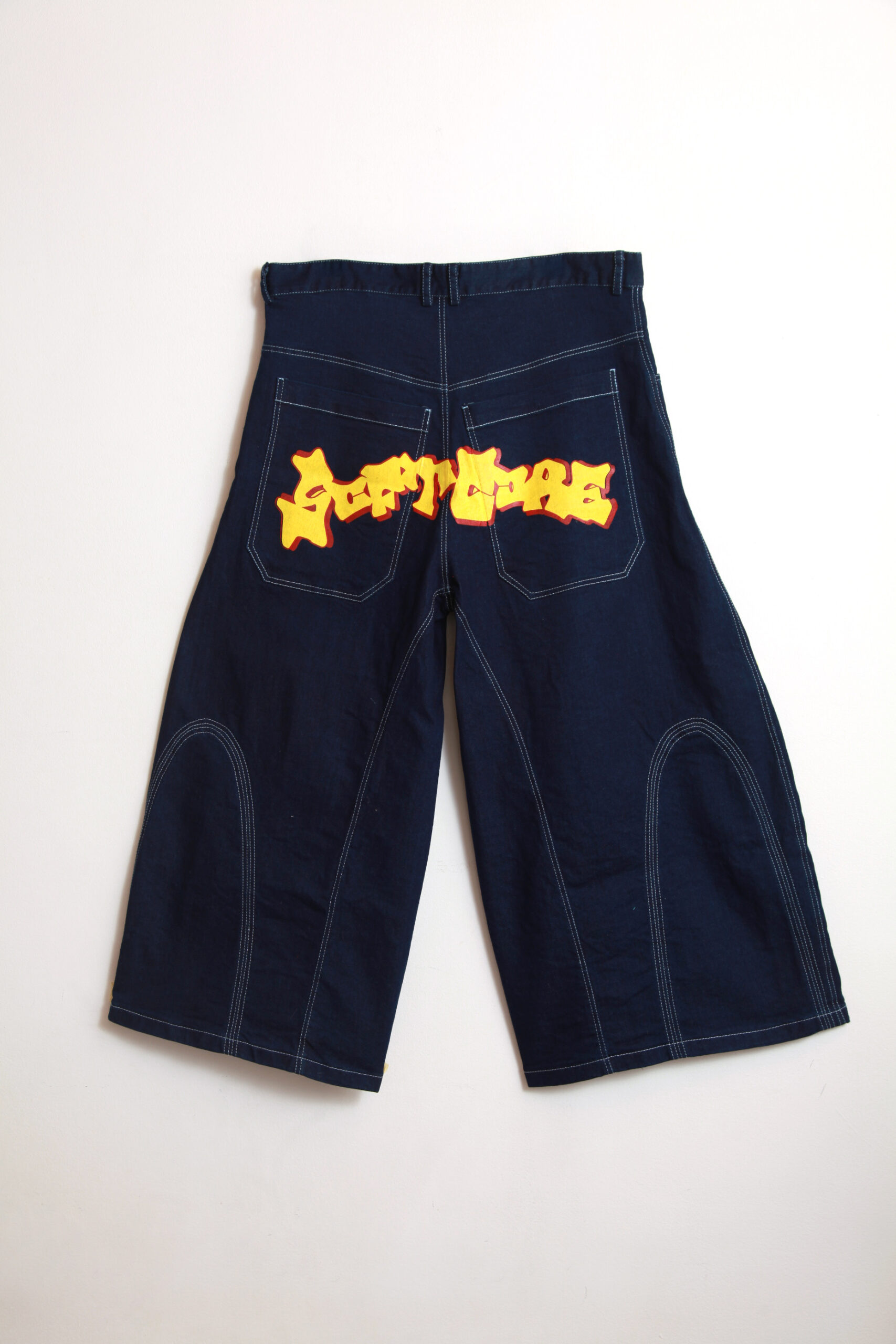 Jeans súper baggy en denim de alta densidad azul oscuro con cortes, mecanismo de cierre con botones.Estampado en la parte posterior SOFTCORE en serigrafía por taller artesanal colombiano.Fit oversized