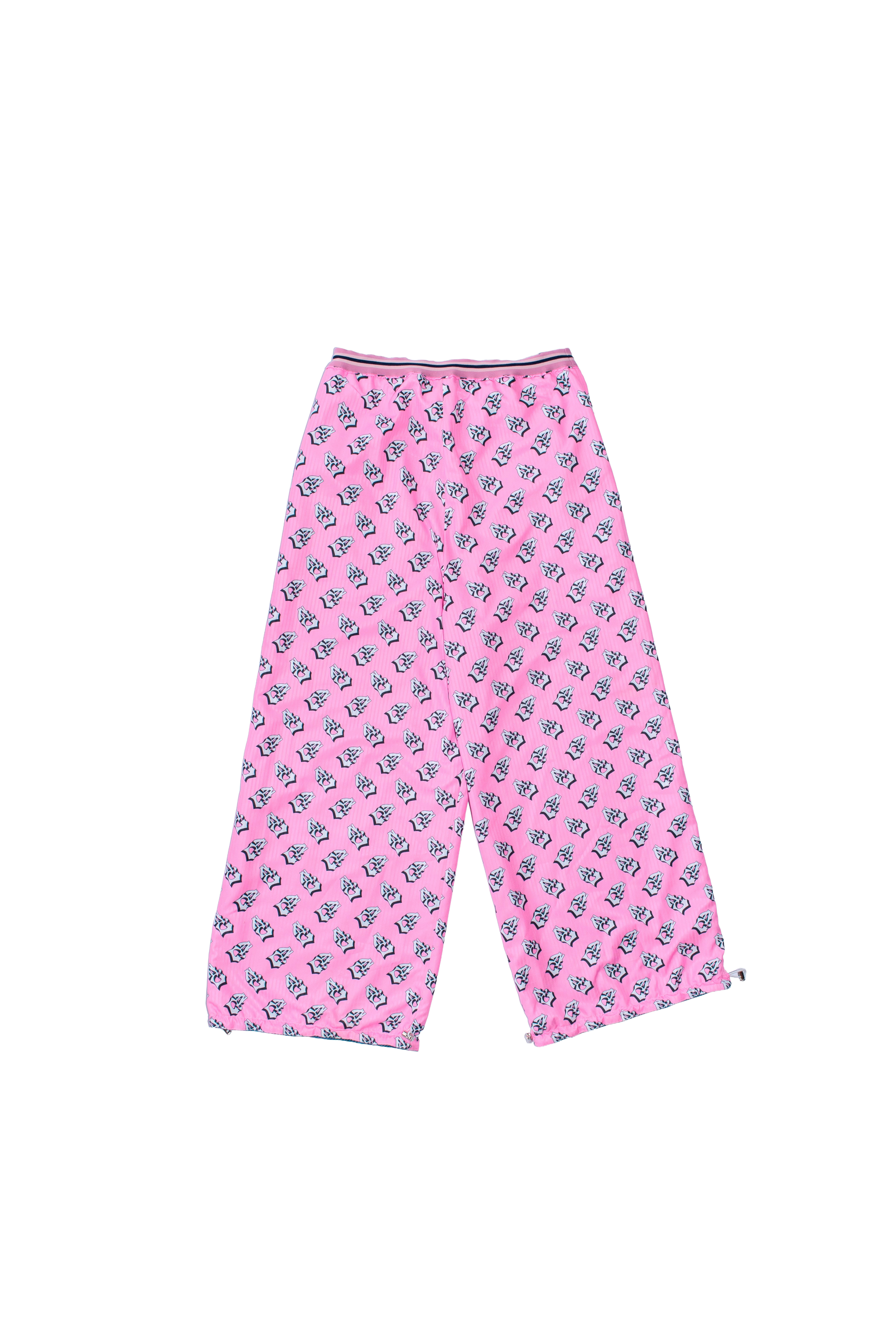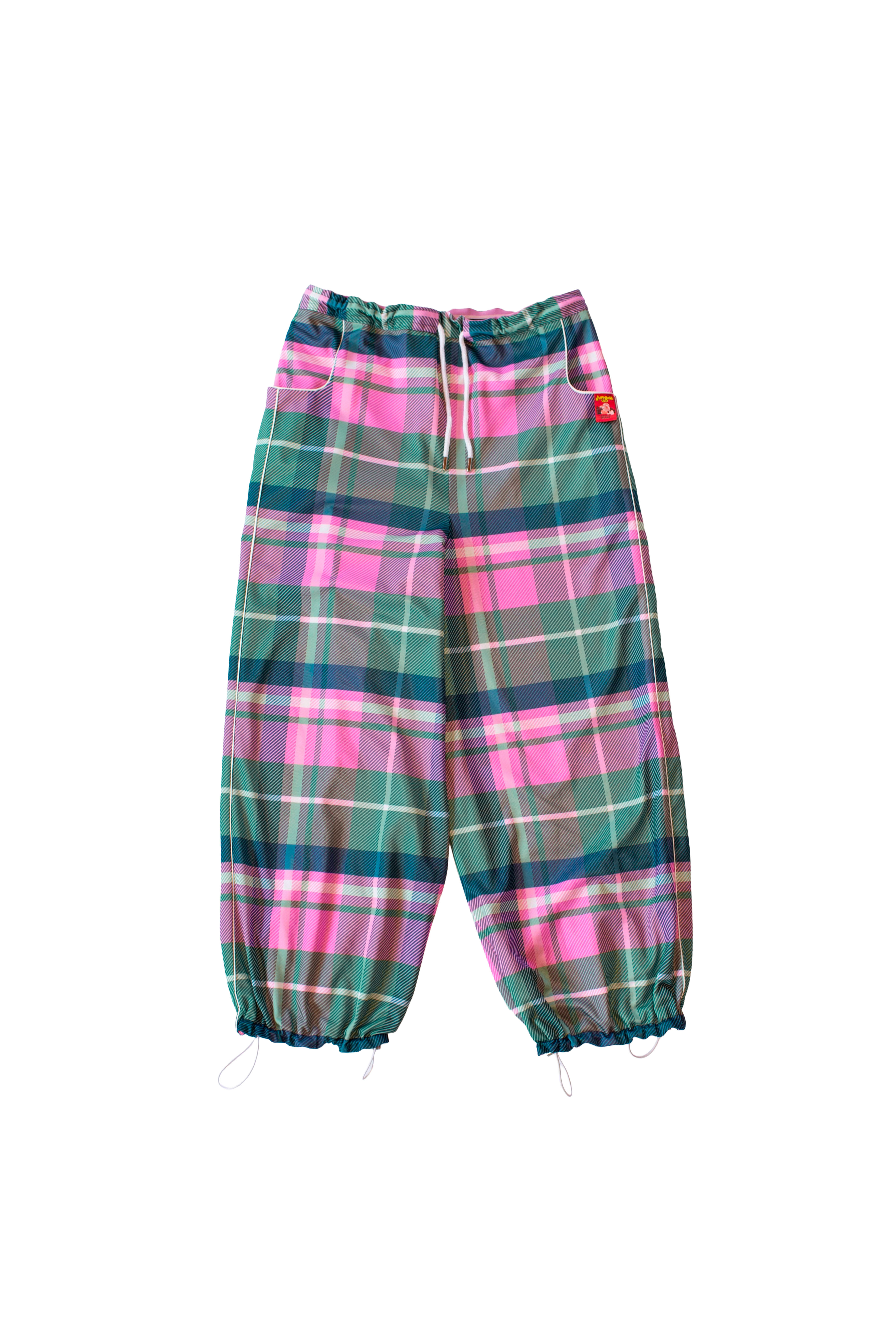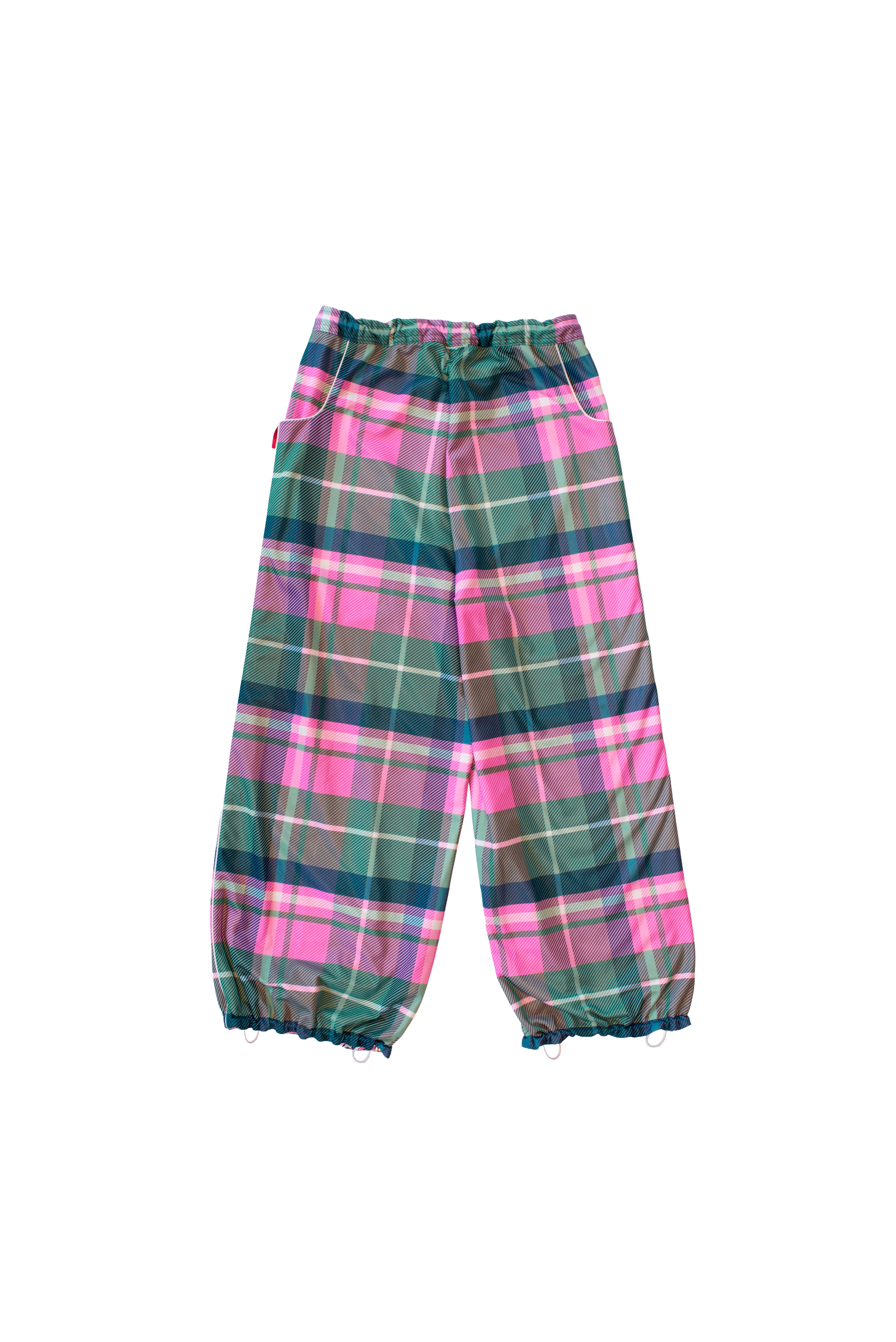 Double-faced reversible pants in tartan and SC monogram, with pockets on both sides; drawstring adjustment on one side and elastic on the other